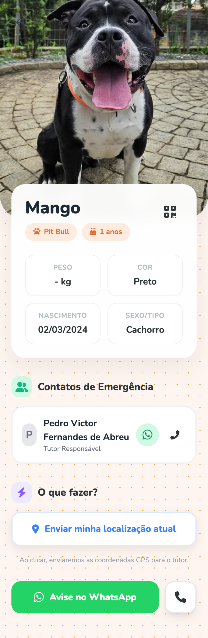 Com o QR Code exclusivo, qualquer pessoa pode escanear o pingente e acessar a ficha completa do pet — com dados do tutor, informações de saúde, contatos de emergência e até links diretos para ligação e WhatsApp.